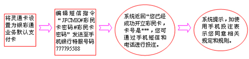五、业务功能: 1. 彩民卡申请、注销: 您可随时在我行营业网点、“金融@家”、我行手机银行申请办理或注销彩民卡。 2. 彩民卡变更: 您可随时在我行营业网点、“金融@家”办理彩民卡的密码修改、重置业务。 3. 彩民卡查询: 您可随时在我行营业网点、“金融@家”通过银行账号查询彩民卡号,或通过彩民卡号查询银行账号。 4. 兑奖: 当您中奖且中奖金额在1万元以下时,我行会按照协议直接将奖金划到您指定的账户中。 5、彩民卡投注 您可通过电话语音、手机短信专用投注号码或我行特约网站进行福利彩票投注。